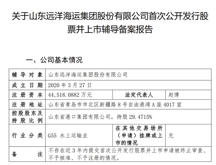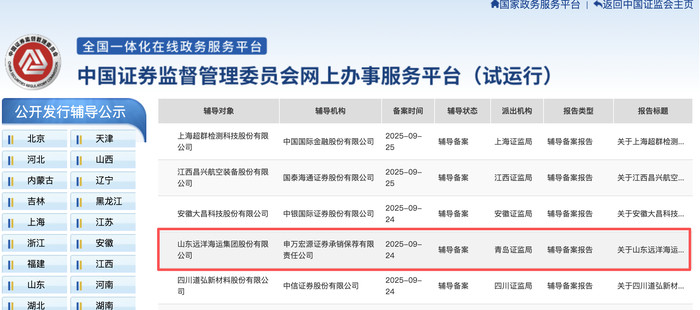 山东省属国企资本证券化步伐加速。据中国证券监督管理委员会网上办事服务平台,2025年9月23日,山东远洋海运集团股份有限公司在青岛证监局办理辅导备案登记,拟首次公开发行股票并上市,辅导券商为申万宏源证券承销保荐有限责任公司。